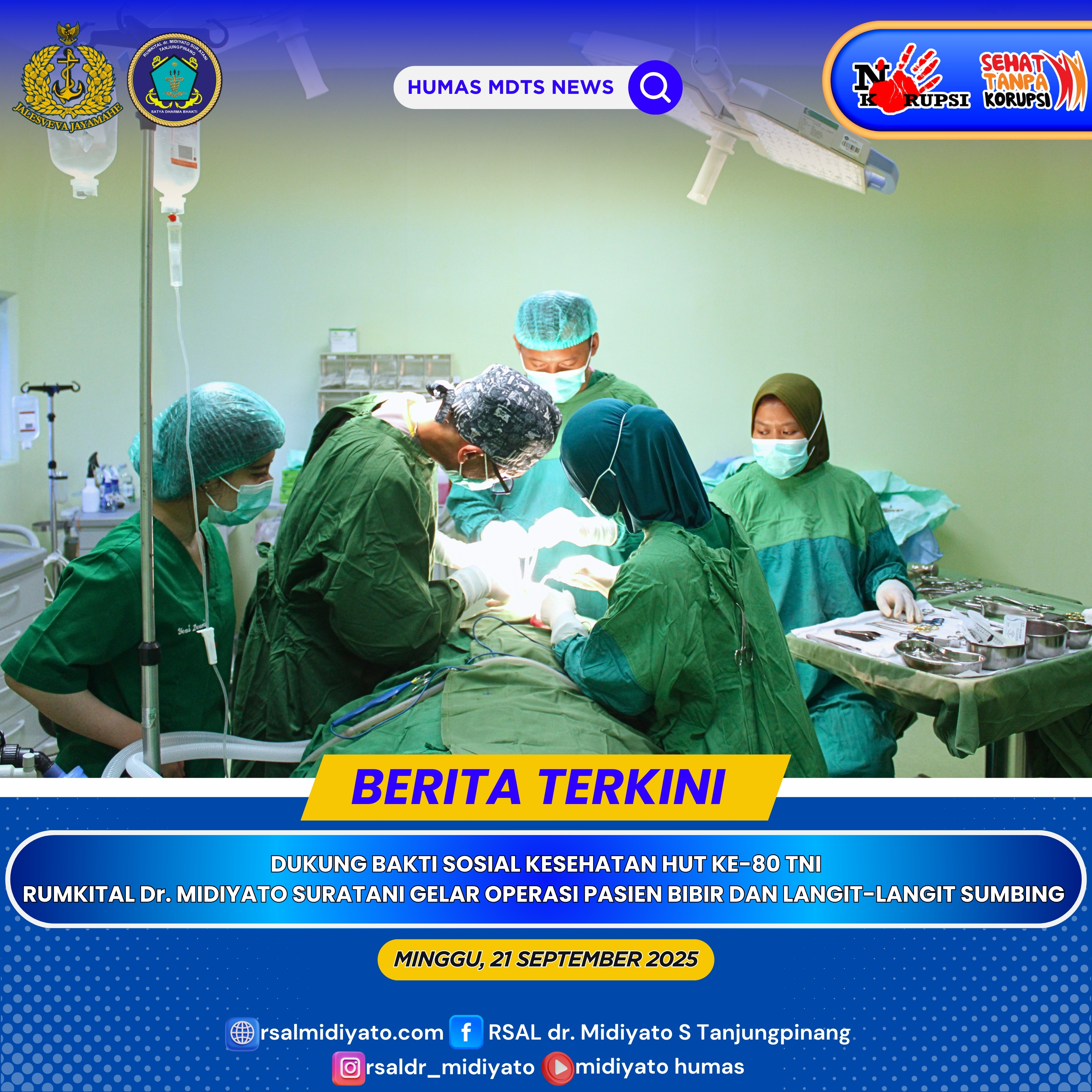 TNI Angkatan Laut. Dalam rangka memperingati Hari Ulang Tahun (HUT) ke-80 Tentara Nasional Indonesia (TNI), Rumah Sakit Angkatan Laut (Rumkital) Dr. Midiyato Suratani melaksanakan kegiatan Bakti Sosial Kesehatan berupa operasi pasien bibir dan langit-langit sumbing serta mengikuti video conference (...