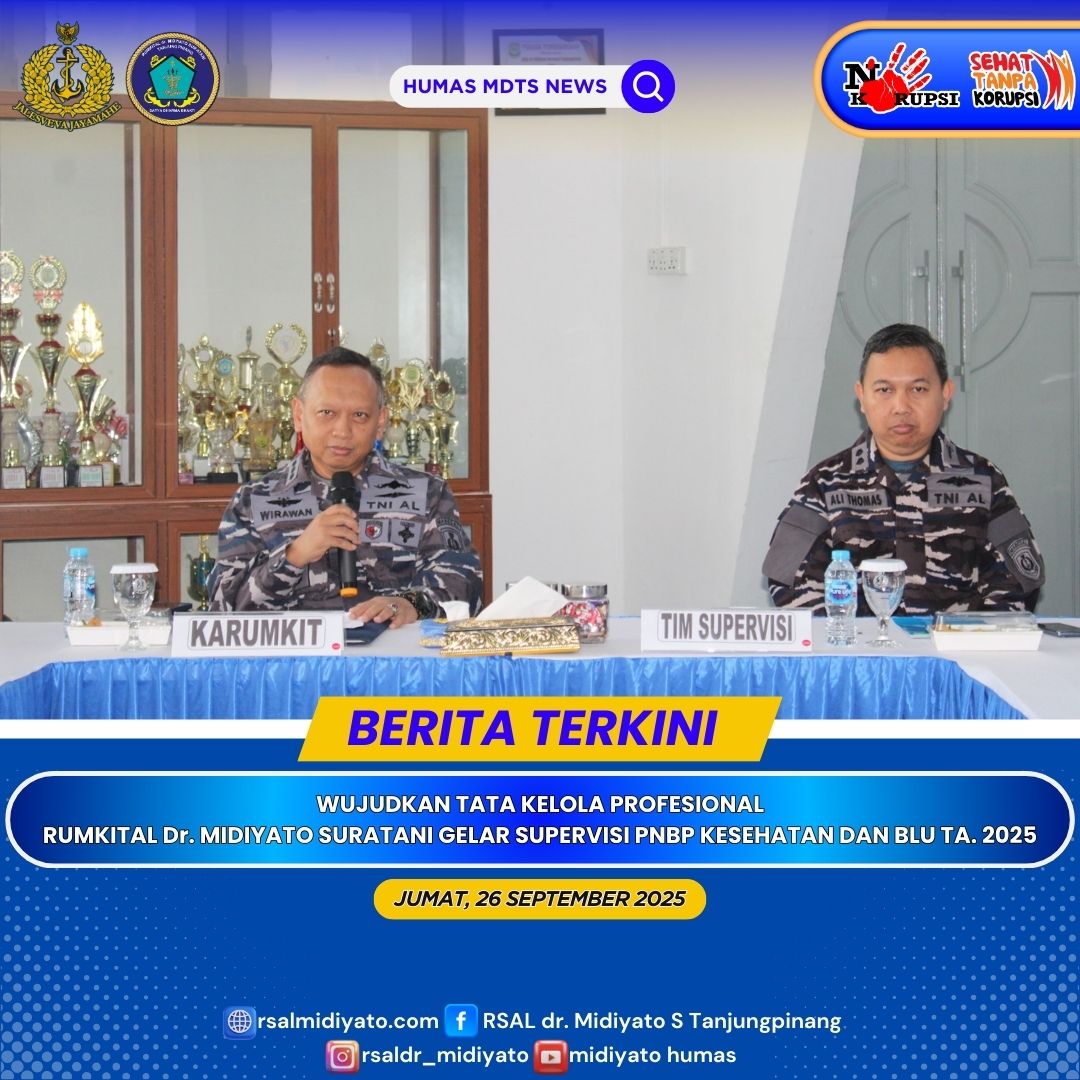TNI Angkatan Laut. Rumah Sakit Angkatan Laut (Rumkital) Dr. Midiyato Suratani menyelenggarakan acara pembukaan Supervisi PNBP Kesehatan dan Badan Layanan Umum (BLU) TA. 2025, bertempat di Gedung Cagar Budaya Rumkital Dr. Midiyato Suratani, Jl. Ciptadi No. 01, Tanjungpinang, Provinsi Kepri. Jumat (26...